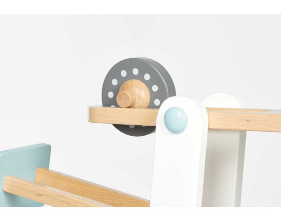 Die Kugelbahn besteht aus vier bunten Kugeln (Ø45mm), einem Auto und vier Kreiselrollen, die die Kugelbahn hinunter sausen und für Spaß und Lärm auf der Straße sorgen.