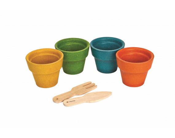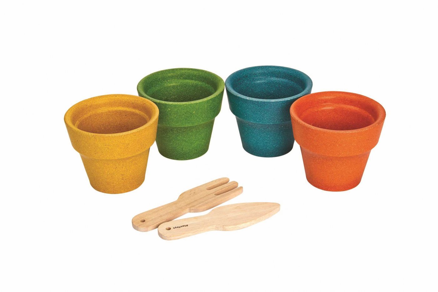Schönes und dekoratives Blumentopf-Set aus Bio-Holz von PlanToys.Set aus 4 Gefäßen in schönen Naturfarben, plus Pflanzlöffel und Harke.