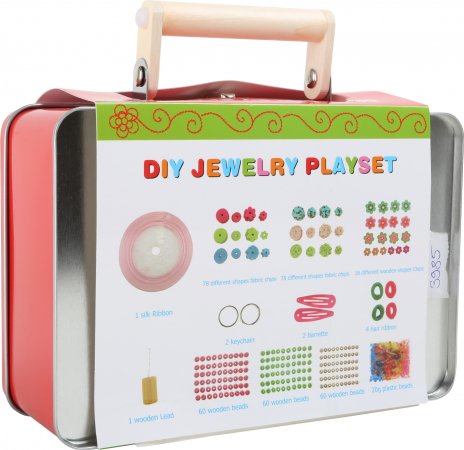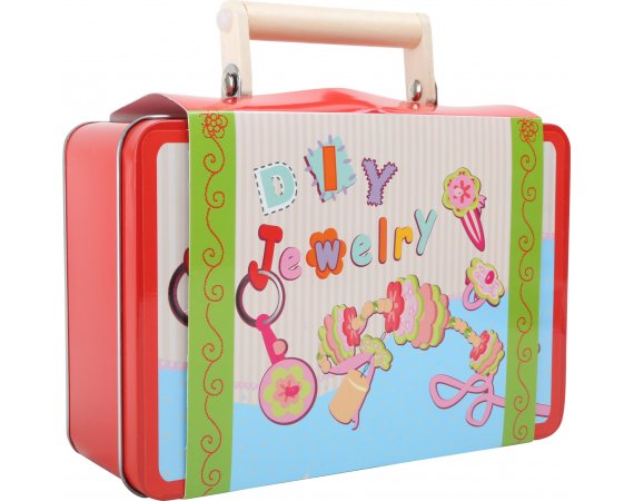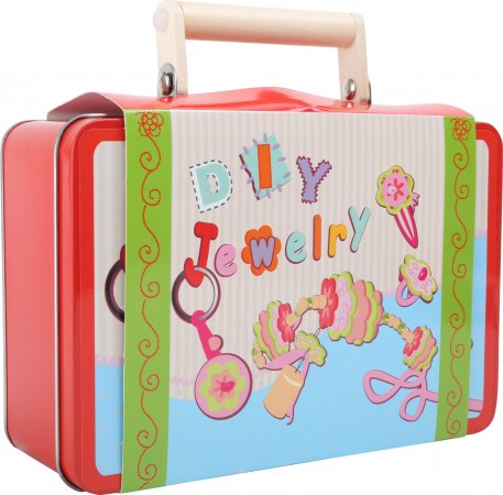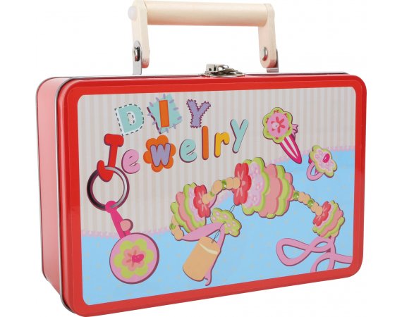 Metallbox mit allem, was ein Schmuckdesigner braucht. Ringe, Ketten, Armbänder, Haarschleifen und Schlüsselanhänger.