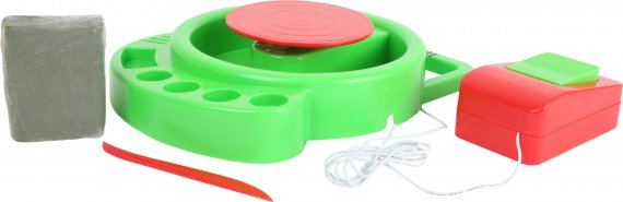 Die Töpferscheibe hat kleine Löcher für Wasser, das für die Formung des Tons wichtig ist. Das Set besteht aus einem kleinen Rad (ca. 13 cm), einem Messer, einem Schwamm und 300 g Ton.