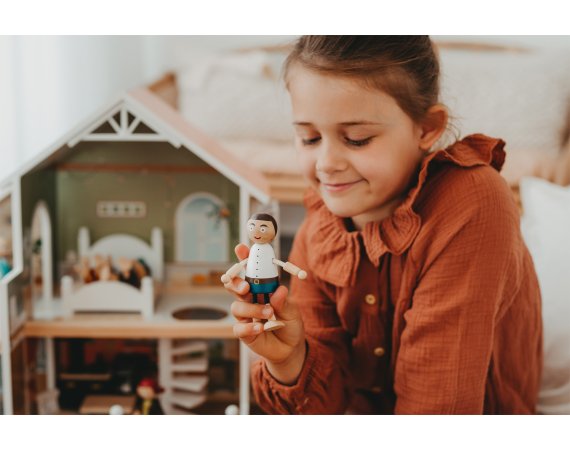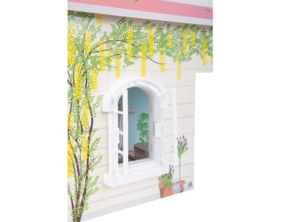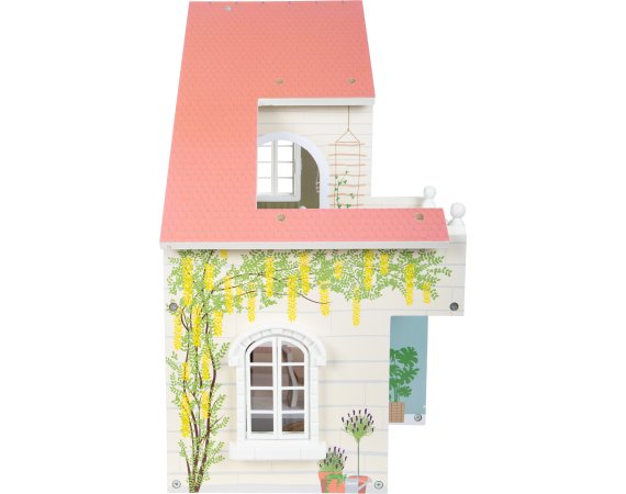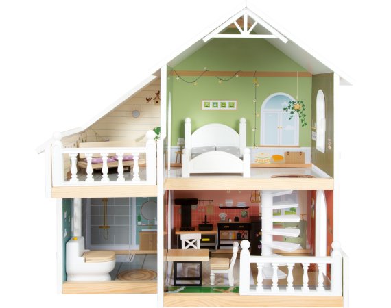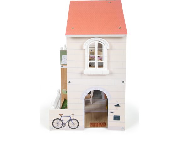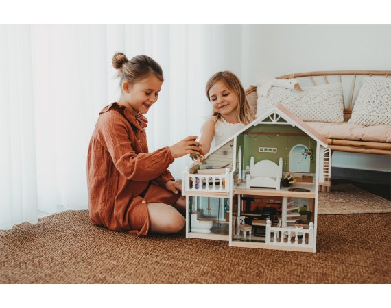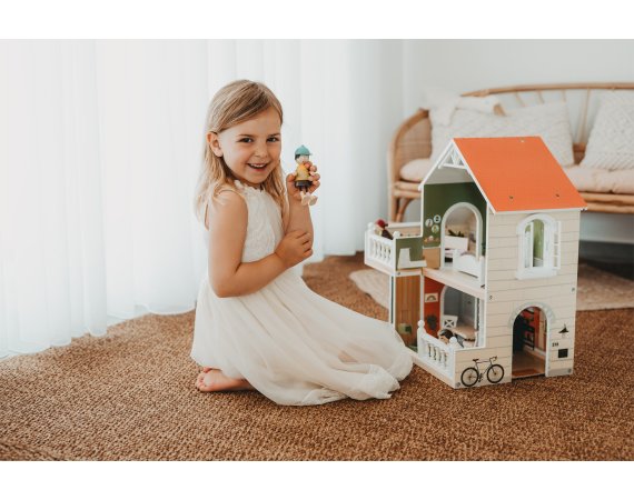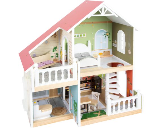 Dieses moderne Holz-Puppenhaus mit offener Front überzeugt durch gestalterische Details, dekorative Akzente und modernen Wohnstil. Wohnküche mit Esszimmer, Schlafzimmer und Bad sowie Dachterrasse und Vorgarten bieten alle Möglichkeiten für fantasievolles Spielen und aktives Rollenspiel. Das offene Wohnkonzept, die Wendeltreppe, zu öffnende Fenster und eine moderne, ebenerdige Dusche mit Acrylglas-Duschwand machen das Puppenhaus zusammen mit acht funktionalen Möbelstücken und Textilelementen wie Bettwäsche und Kissen zum Hingucker im Kinderzimmer.