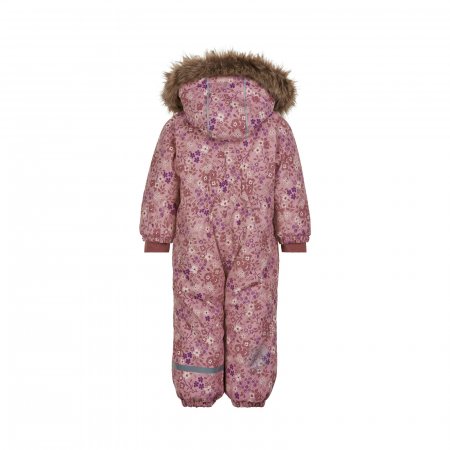 Schöner wind- und wasserdichter pinker Anzug mit Blumendruck und hübschem Quastendetail von Minymo.