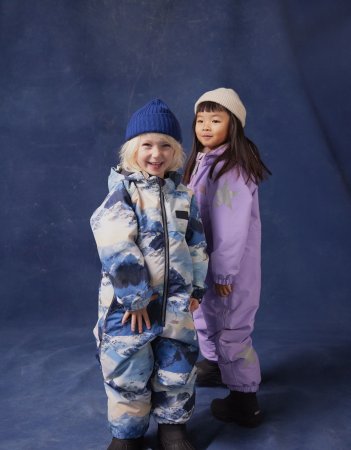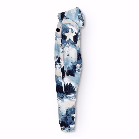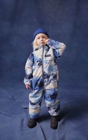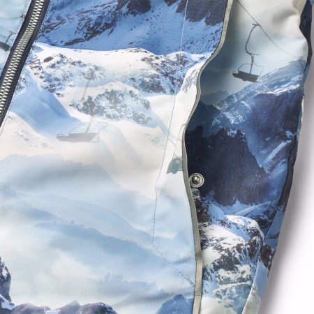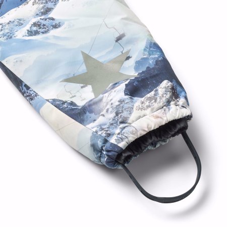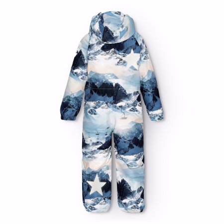 Schneeanzug mit wunderschöner Bergkulisse, reflektierenden Paspeln und den bekannten Sternreflektoren von Molo an der Seite und am Rücken des Schneeanzugs.