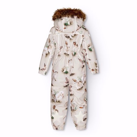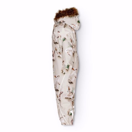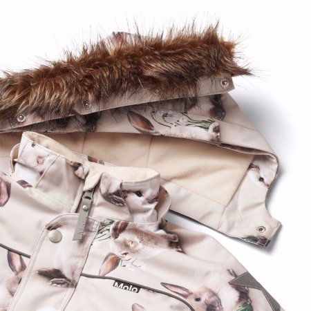 Die Kapuze des Schneeanzugs ist mit Fleece gefüttert, hat Druckknöpfe und ist abnehmbar. Es hat einen schönen Kunstfellbesatz und einen elastischen Besatz oben an der Gesichtsöffnung.