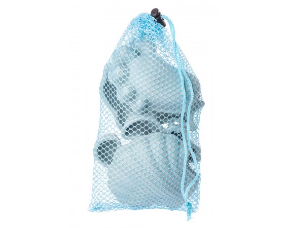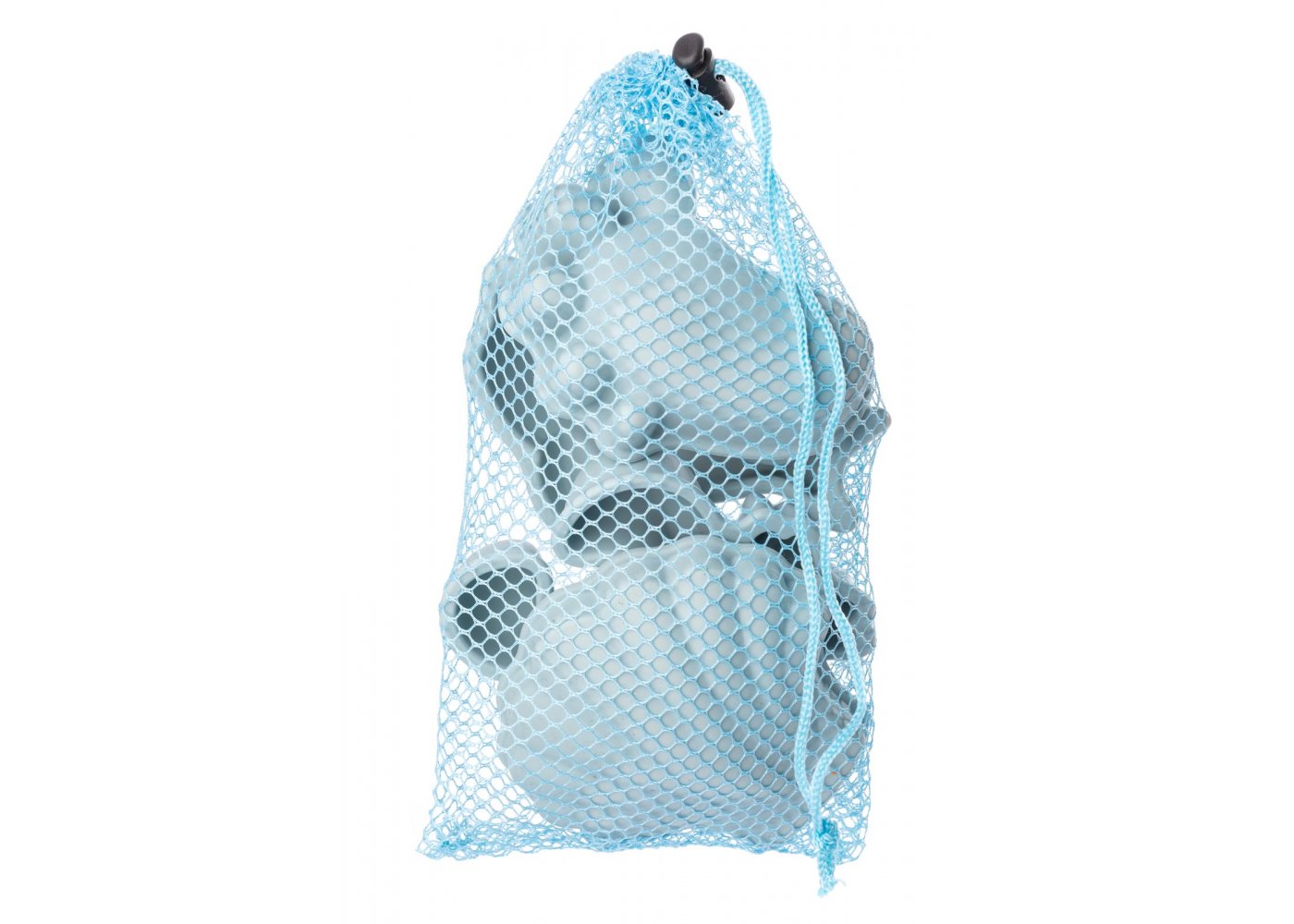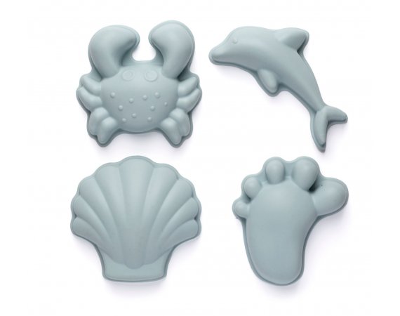 Vier schöne kleine hellblaue Silikon Sandförmchen im Netz von Scrunch.