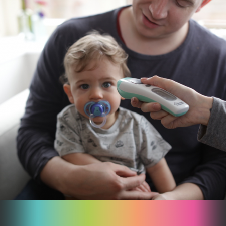 Das Thermometer ist schnell, genau und wirklich einfach zu bedienen. Halten Sie den Scanner bis zu 4 cm von der Mitte der Stirn Ihres Kindes entfernt, drücken Sie die Starttaste und die Temperatur wird innerhalb von zwei Sekunden auf dem LCD-Display angezeigt. Das Thermometer hat eine Fieberanzeige, die anzeigt, wenn die Temperatur zu hoch ist.