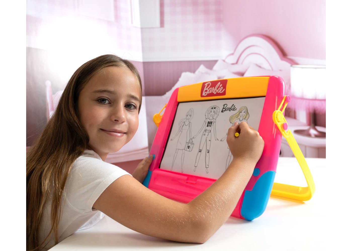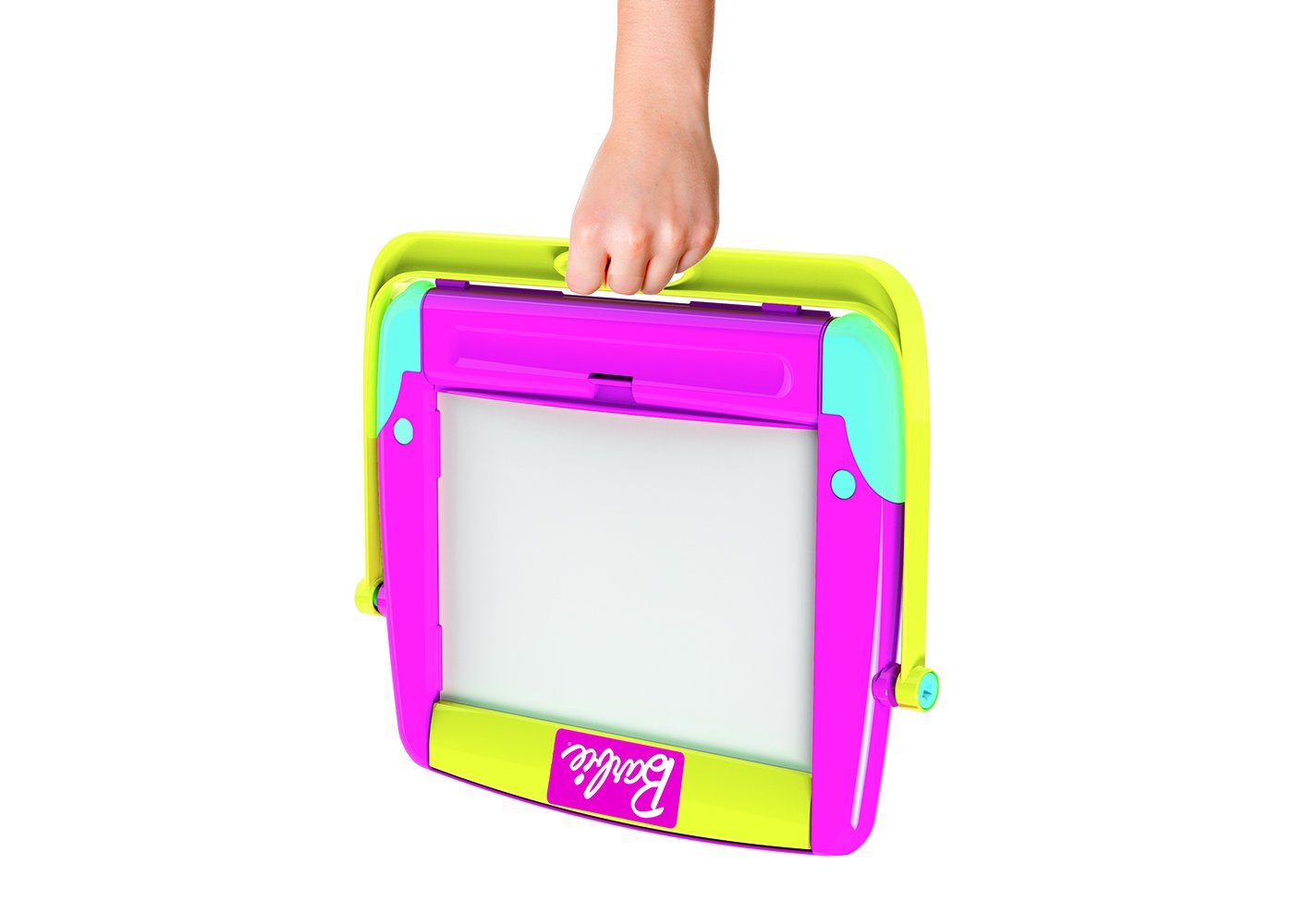 Das clevere Staffelei besteht aus einer Tafel mit Magnetfunktion und einem Whiteboard, auf dem Papier befestigt werden kann. Auf der anderen Seite des Staffeleis befindet sich eine vorgedruckte Platte, auf der man seine kreativen Fähigkeiten entfalten und wunderschöne Barbie-Motive gestalten kann.
