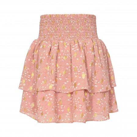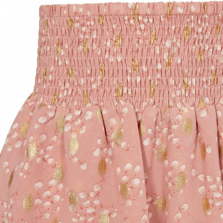 Süßer und romantischer Rock von Petit by Sofie Schnoor in rosa Farbe und mit schönen Blumen und großen Goldpunkten.Der Rock hat einen breiten bequemen Gummizug in der Taille für eine tolle Passform. Es hat zwei gerippte Lagen, was tolle Falten und eine gute Weite ergibt. Im Inneren sorgt eine feste rosa Schicht dafür, dass der Rock nicht durchsichtig ist.