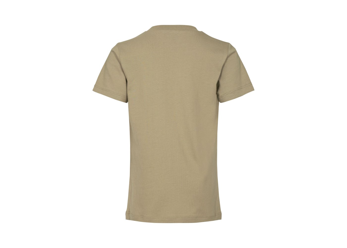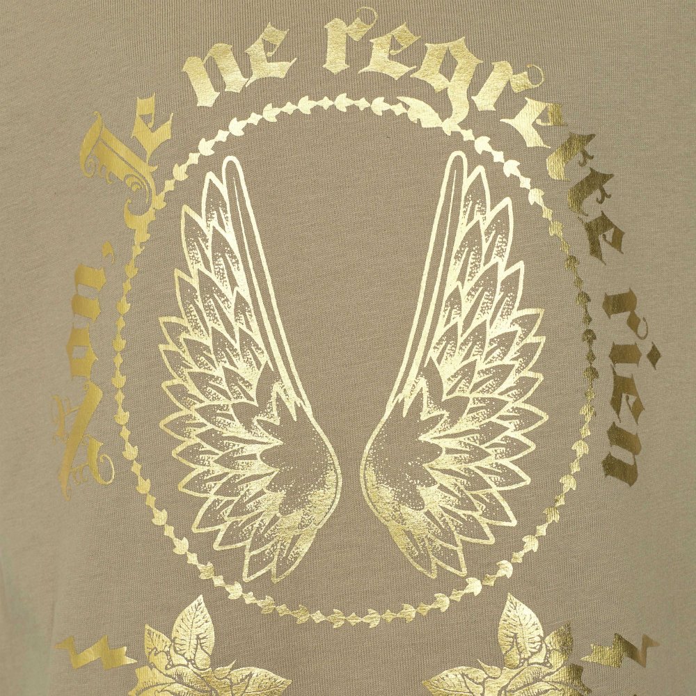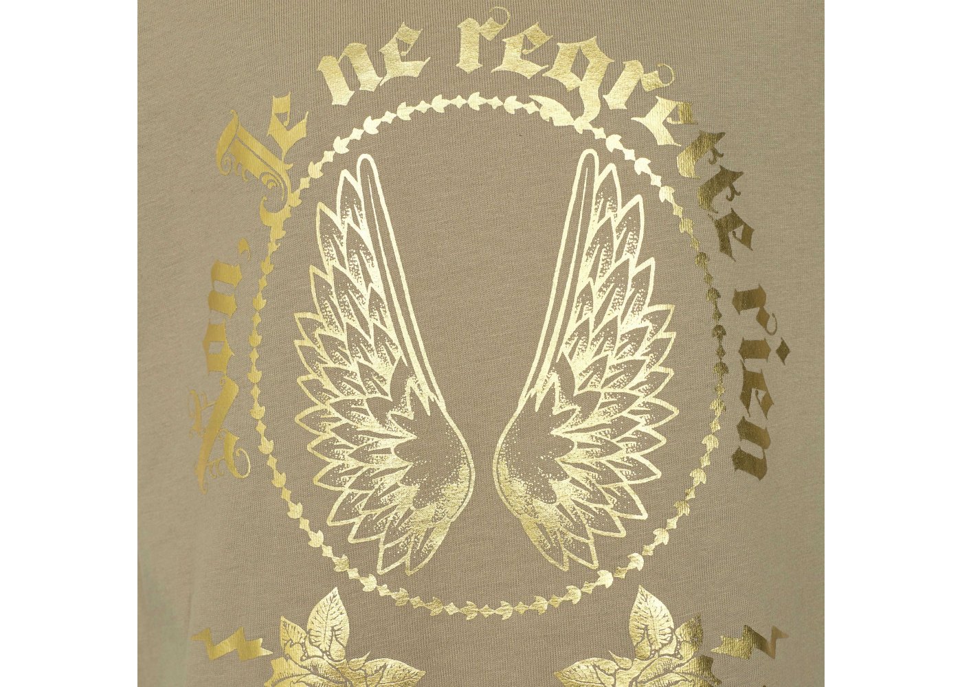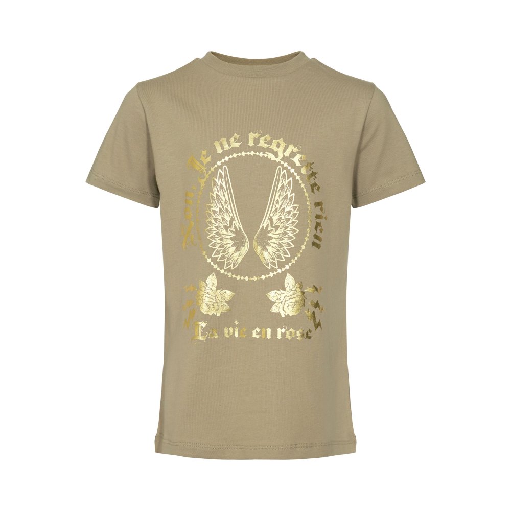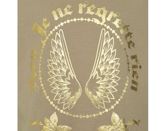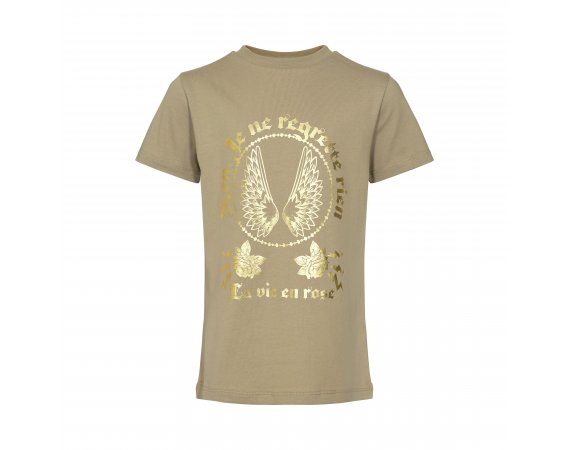 Schönes Kurzarm-T-Shirt in Grün.Das T-Shirt hat auf der Vorderseite einen goldenen Flügeldruck und ist auf der Rückseite einfarbig.