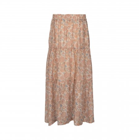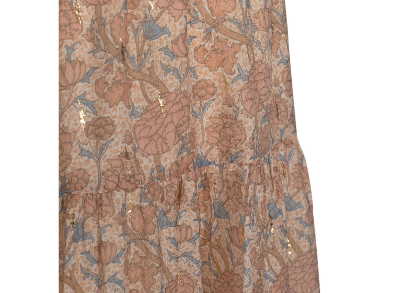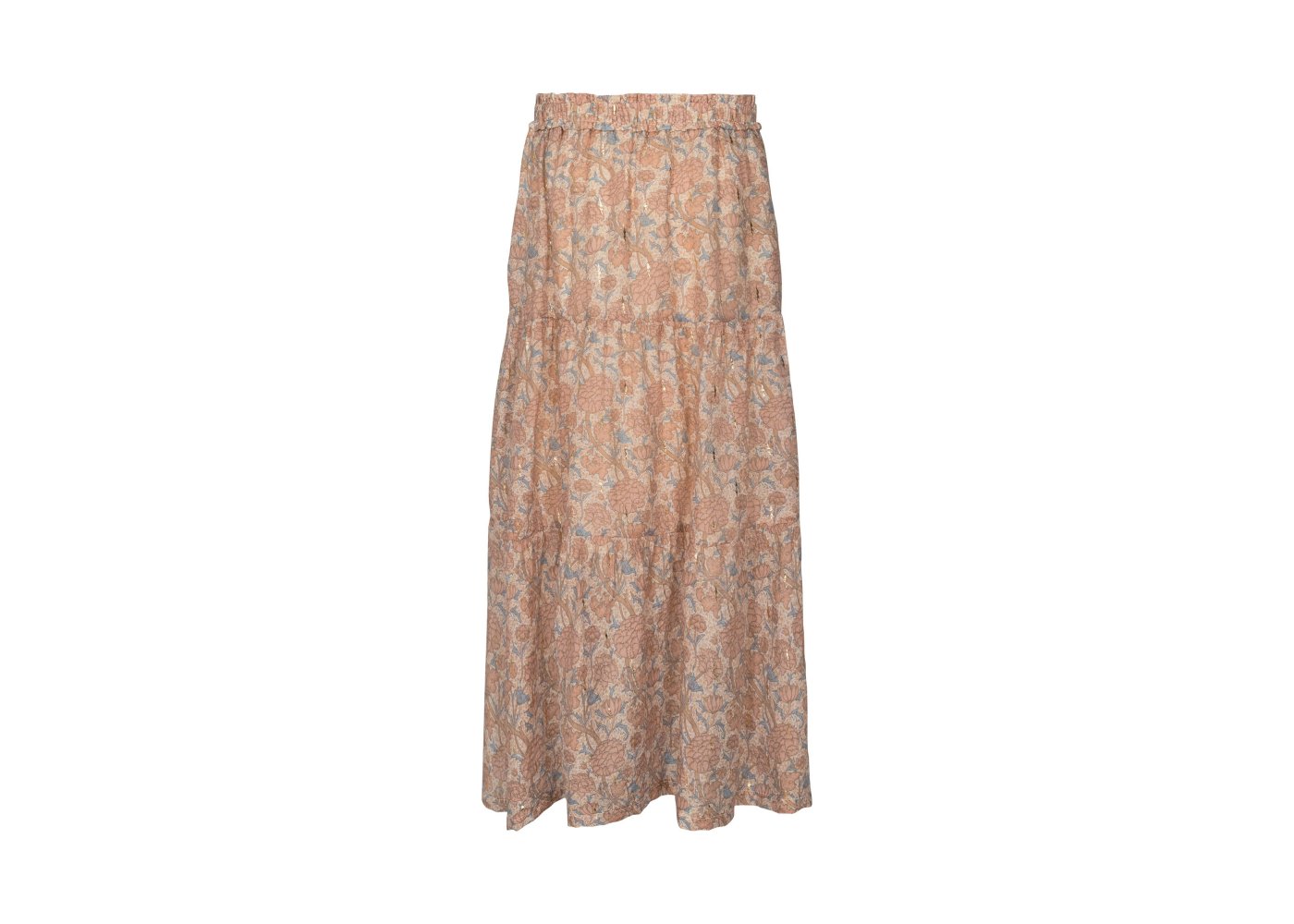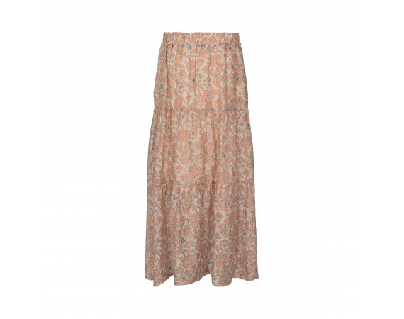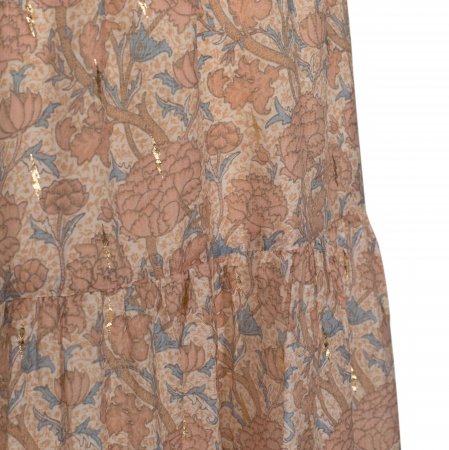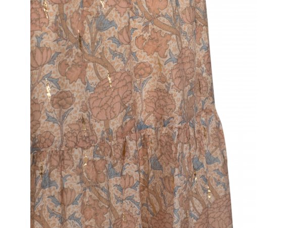 Anmutiger und romantischer Rock mit schönem floralem Muster in Rosa-, Blau- und Beigetönen und mit kleinen feinen Goldstreifen.