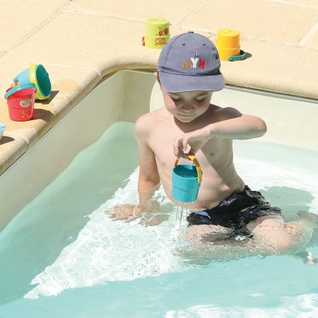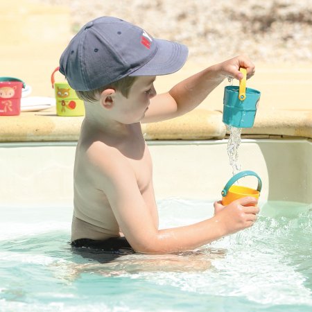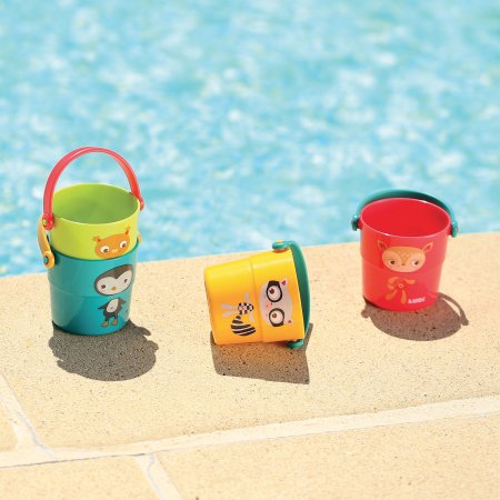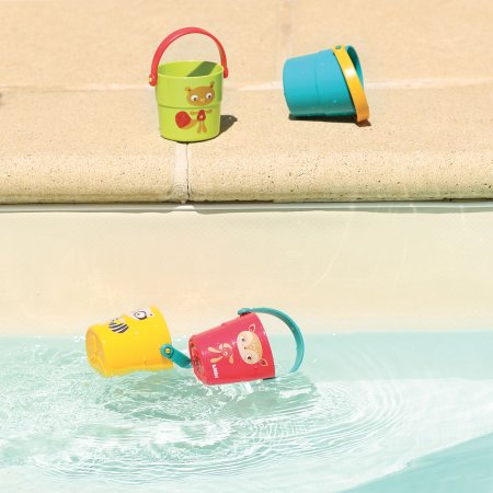Die Eimer können gestapelt werden und haben verschiedene Löcher, die jeweils unterschiedliche Wassereffekte erzeugen, so dass es viel Spaß macht, mit ihnen zu spielen und sie zu erkunden.
