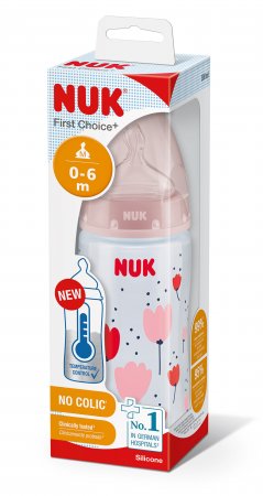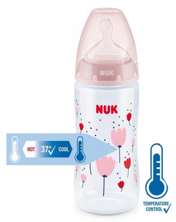 Die NUK First Choice+ PP-Kunststoffflasche hat eine Temperaturanzeige auf der Flasche, die anzeigt, ob der Inhalt die richtige Temperatur, ca. 37°C, hat.