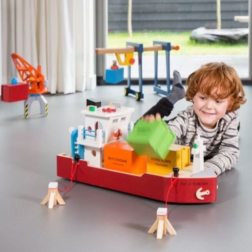 Super tolles und großes Containerschiff n Holz mit 4 Container von New Classic Toys.Hier bekommen Sie das beste Holzspielzeug.